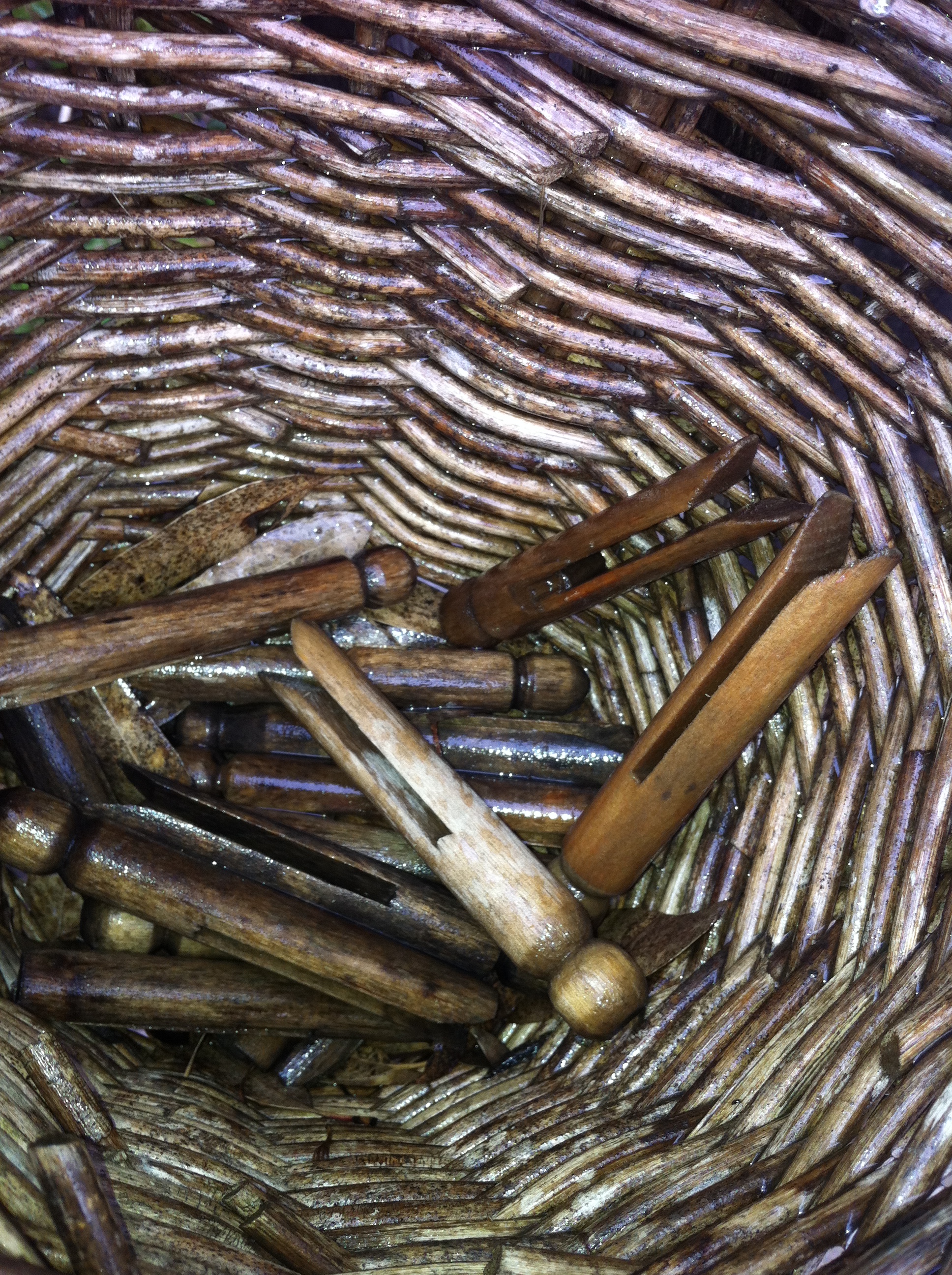 Simple wooden pegs were used to attach clothes to a rope line. The pegs also doubled as toys for children to use to make peg-dolls. Some established houses would have a clothes line, others may string up the rope wherever they had space.