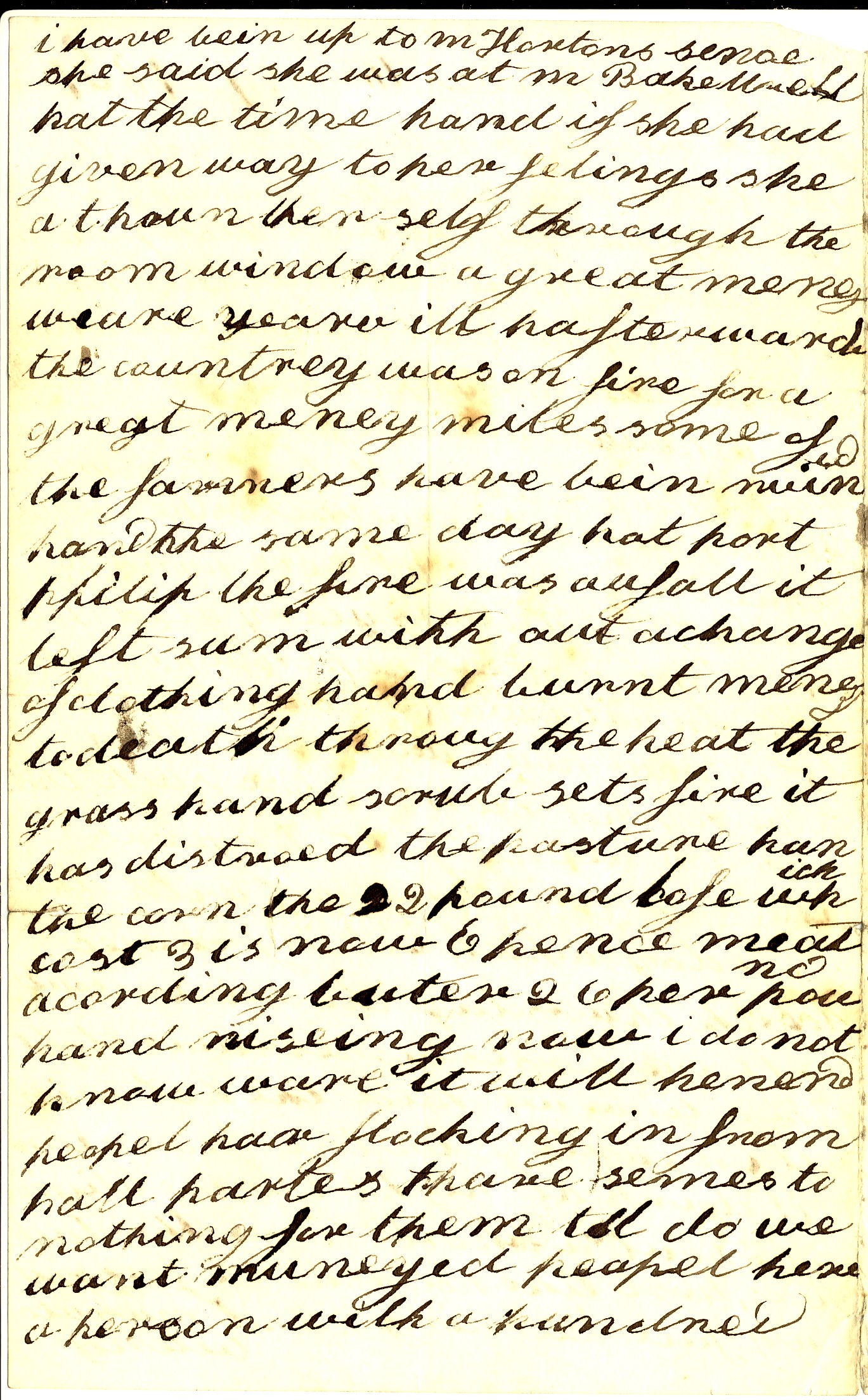 …The 2 pound coffee which cost 3 [pence] is now 6 pence. Meat according butter [now] 2 [and] 6 per pound and rising now. I do not know where it will end… You wish to know about the price of fish called ‘garfish,’ [which is] about the size of a Yarmouth herring. [It is] pence per [???]. Others in proportion, fowls [are] about 3 [and] 6 per pair. I have not seen a fire grate since I’ve been here. There is a sewer [?] hole left at the bottom level with the flour, and we burn wood, which is very dear [at] 18 shillings for a small cartload. Our chief vegetable is potatoes. [At] 7 pounds for 6 very likely we shall get them cheaper when we have got a marketplace…