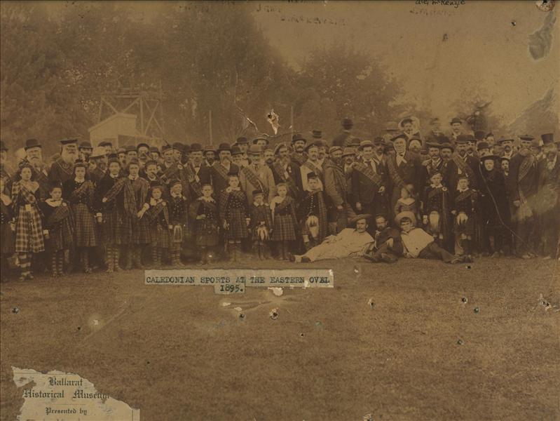 The Scots in Ballarat were quick to form a Caledonian Society, (November 1858), and New Year’s Day Caledonian Sports featured prominently on the Ballarat social calendar for many years. Withers records the first sports day on 1 January 1859, on what later became the Eastern Oval. Mr. Hugh Gray presided over the event, and was clearly a popular Scottish identity in Ballarat: the Ballarat Star remembered him fondly in his shepherd’s plaid costume, officiating with untiring energy at the annual gatherings – a “devoted lover of ‘Caledonia stern and wild’. (Ballarat Star, 3 June, 1880, Obituary).