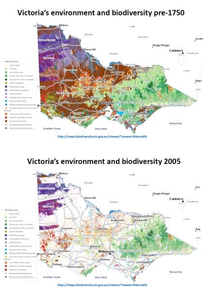Maps showing how much the surface of the landscapes have changed in Victoria since colonisation. Reproduced with permission from: https://www.environment.vic.gov.au/biodiversity/naturekit
