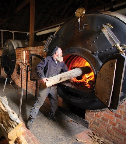 Sovereign Hill employee in the role of Boiler Attendant feeds a boiler to produce the steam to power working steam exhibits. During Australia’s Industrial Revolution, lots of communities burnt wood from local forests, instead of coal like their European equals to power their steam engines.