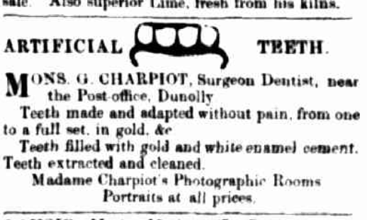 When the Charpiot’s moved to Dunolly, both continued their businesses; Madame Charpiot’s portrait services were regularly advertised alongside her husband’s dental business.