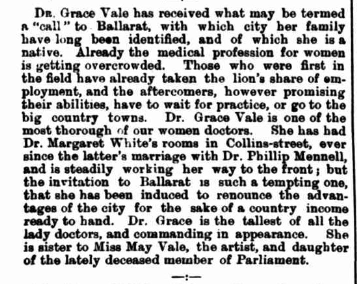 The article below gives a hint of the medical environment in which Dr Vale worked. The “medical profession for women” suggests that only part of the profession is open to them and they are always described as “woman” or “lady” doctors specifically. She has been working in the practice of another woman doctor, Margaret Whyte with whom she had graduated. Her appearance, rather than her abilities, becoming the focus of newspaper articles. In closing remarks, she is described as “the tallest of all the lady doctors, and commanding in appearance.”