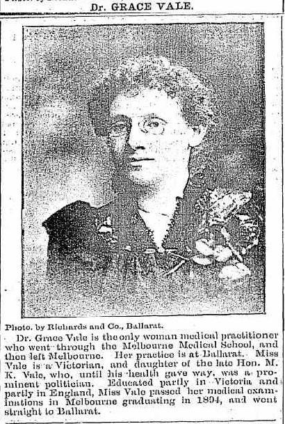 As a founding member of the Victorian Medical Women Society, one of the first female graduates from medical school in Melbourne, and then the first woman public vaccinator (in 1910), Dr. Vale became both a doctor and an active public figure in Ballarat, including being highly active in the suffrage movement to give women the vote. She was present for the first X-rays experiments at the Ballarat School of Mines.