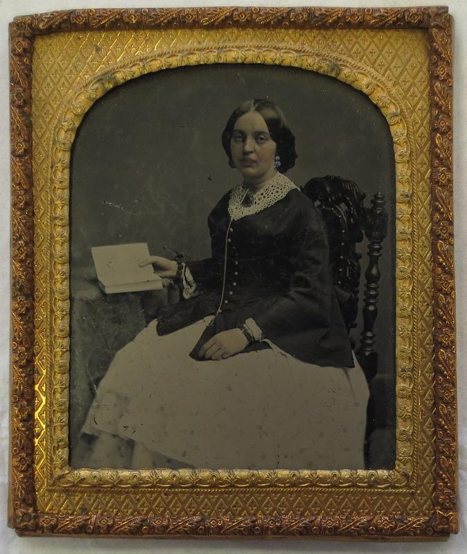 A daguerreotype is the first form of commercial photography. A silver-plated copper plate was treated with a light-sensitive material that reacted when exposed to light. The plate was developed and fixed in a chemical bath, so it was a unique, single image. Our collection includes several examples of daguerreotypes like the style that Elizabeth was producing. The daguerreotype below is carefully mounted and beautifully framed. The lady is wearing several pieces of jewellery and carefully holding a book open – why do you think she chose to include a book in her picture?