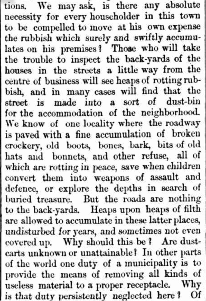 In our nineteenth century streets we did not have rubbish bins (or recycling or green waste bins either) so where did all the rubbish go? Did no-one throw anything away? Not exactly. Letters to the newspaper describe some very dirty streets and backyards and complain about the fact that we do not have an organised system to pay for or remove waste.