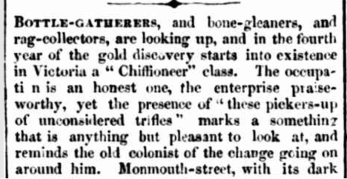 1855 ‘No Title’, Geelong Advertiser and Intelligencer (Vic. : 1851 – 1856), 25 September, p. 2. (DAILY), viewed 26 Jun 2025, http://nla.gov.au/nla.news-article91871240 Chiffioneer refers to a French term for “rag-picker,” and in English came to refer to a popular piece of ‘useful’ furniture.